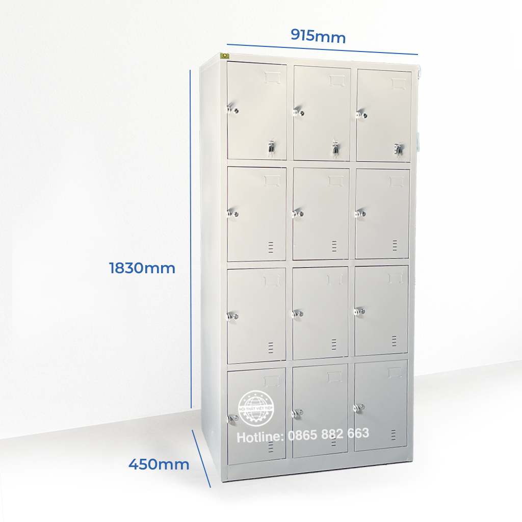 Tủ được chia thành 12 khoang riêng biệt (3 cột × 4 hàng), mỗi ngăn đều có khóa riêng và bảng tên tiện dụng, giúp phân chia người dùng rõ ràng. Tủ được làm từ thép sơn tĩnh điện cao cấp, bề mặt sơn mịn, chống han gỉ – dễ vệ sinh và bền đẹp trong quá trình sử dụng.